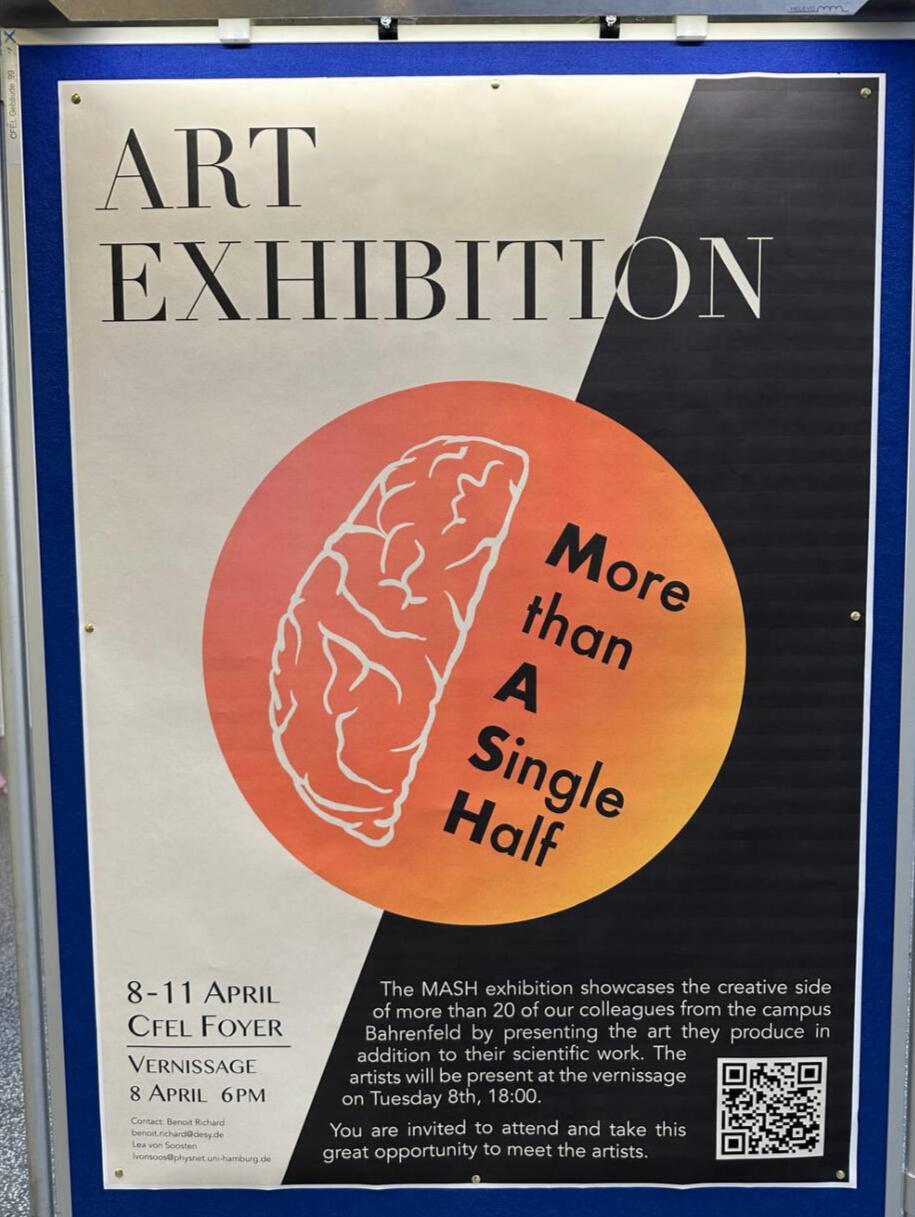 We are excited to invite you to visit the second MASH (More than A Single Half) art exhibition, that will be held from February 17 to February 20 in the CFEL Foyer and 1st floor. Come to discover the work of the artists (who also work or study on the Bahrenfeld campus besides their artistic endeavors) that are showing their creations.The perfect moment to visit us is on February 17 at 6pm, as the artists will be present to share their experience and discuss their art during the vernissage.We are looking forward to welcome and share a small artistic moment with all of you!